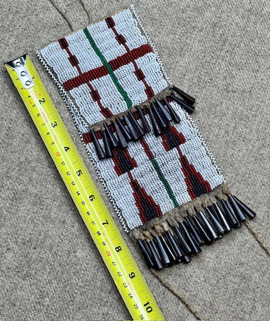 Native American Beaded Strike-A-Light-Bag is sinew sewn brainwashed hand scraped hide. This Native American Beaded Strike-A-Light-Bag was part of a large collection I just purchased. This Native American Beaded Strike-A-Light-Bag has hand rolled cones and makes that "jingle" sound we all love. Nice tight beadwork with some honest wear and patina. This Beaded Beauty displays like a Museum Piece and will add a splash of Native American Culture to any room.