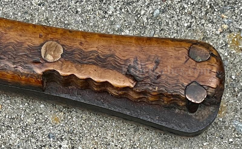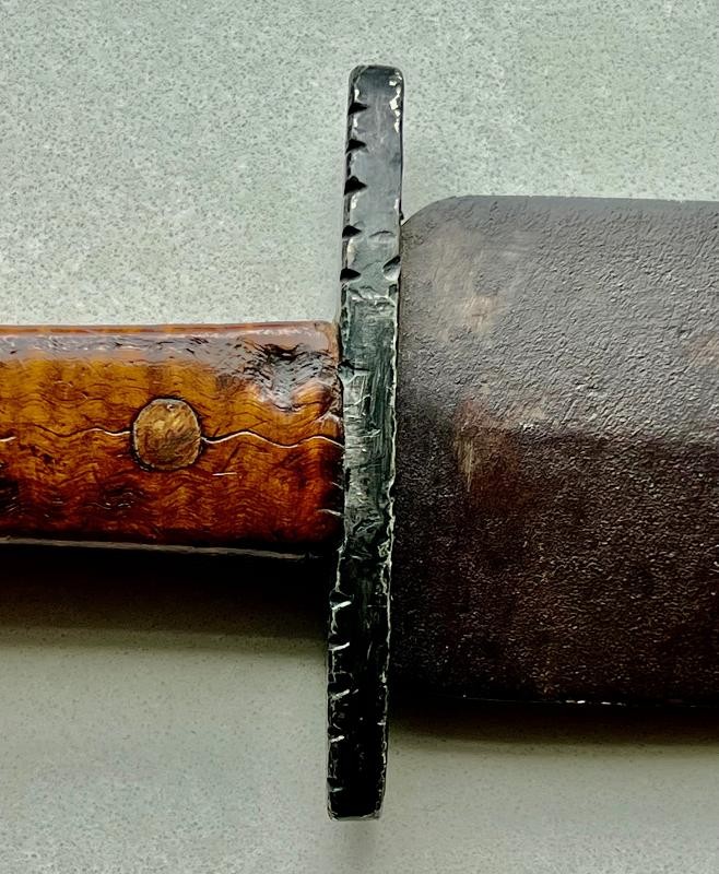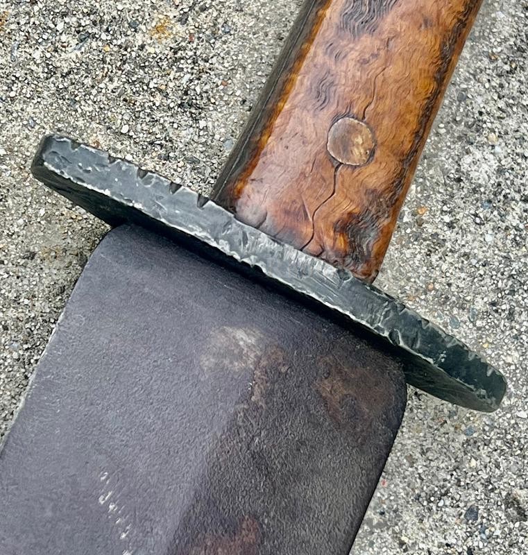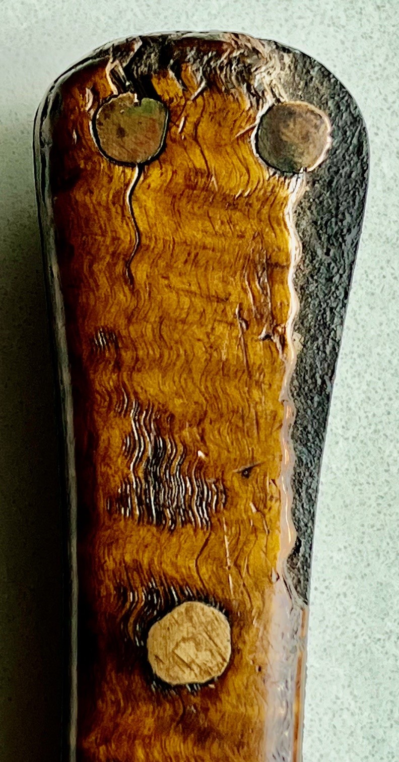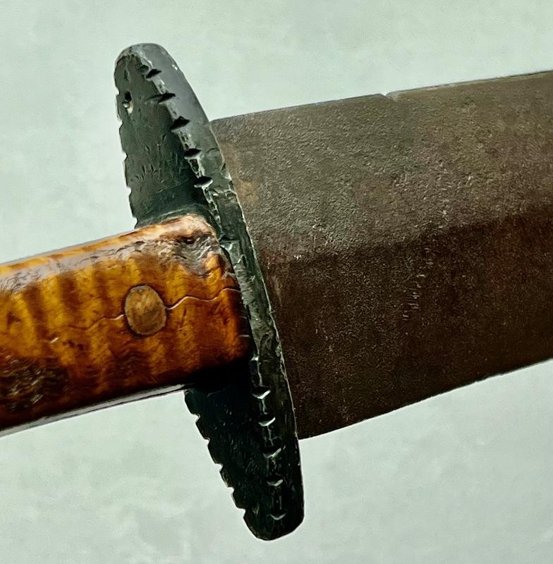 Confederate Fighting Knife with killer tiger stripe maple handle. This Confederate Fighting Knife has a blade like so many we see from the 1861 Southern Blacksmith hammers. This spear point has a nice median ridge. The cross guard is file decorated and was originally polished. This Confederate Fighting Knife a hefty 11 1/2" blade. Each side of the tiger maple handle has some battle wear. The handle broke along the tiger stripe. which actually looks cool. This is a "Yankee Slayer" if there ever was one.