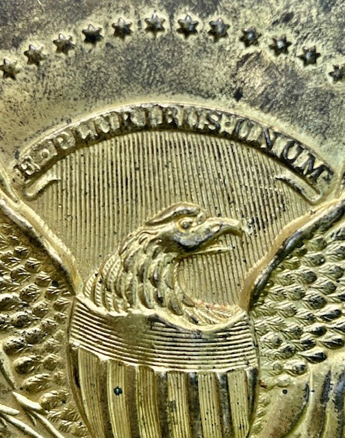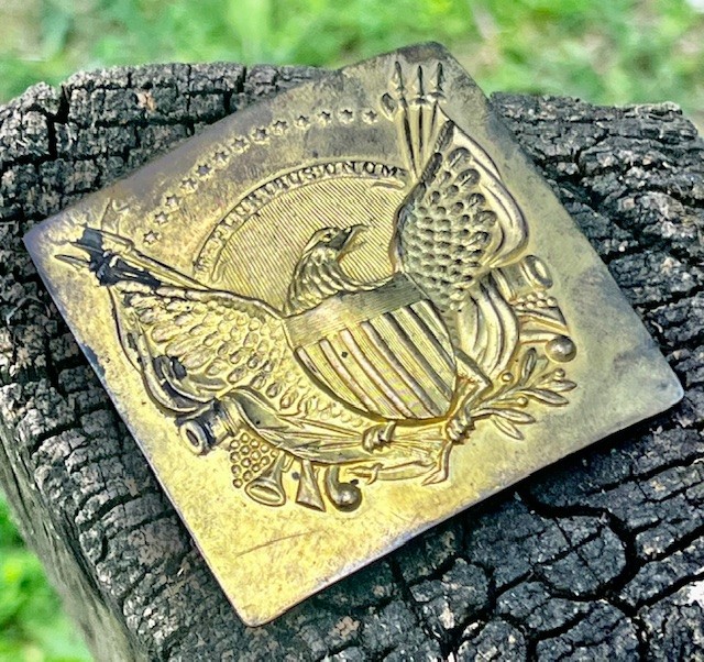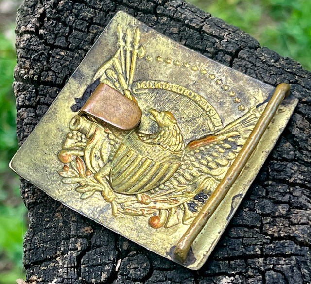 Eagle Belt Plate with beautiful die stamped gold wash patriotic eagle. This Eagle Belt Plate is early 1800s with soldered on tongue and bar. I love these Militia Eagle Belt Plates and this one displays like a million bucks.