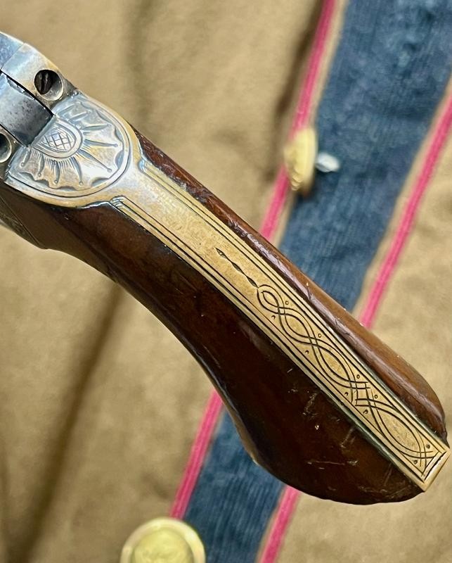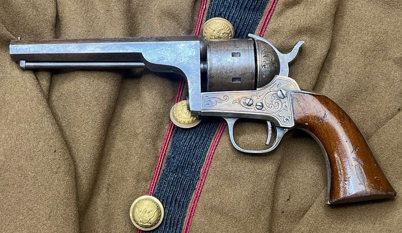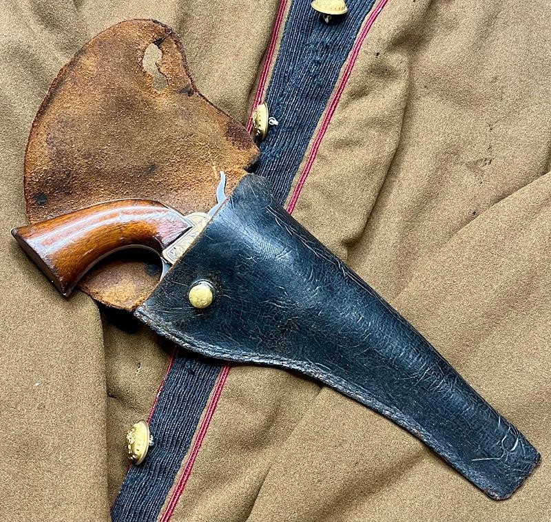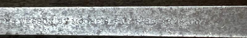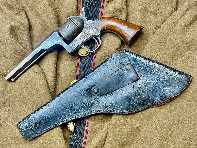 Smith & Wesson Marked Moore Revolver with leather flap holster. This Smith & Wesson Marked Moore Revolver has beautiful eye appeal. I have always loved these engraved brass frame civil war revolvers. They just look "REBEL" to me. This Smith & Wesson Marked Moore Revolver has nice working action with wonderful original wood grips. The barrel address is better than images show. This Smith & Wesson Marked Moore Revolver surfaced with this holster and make an awesome set. Rebel Relics priced for unbeatable value.