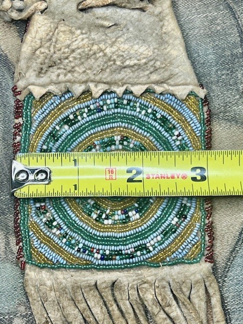 Native American Beaded Leather Bag from the late 1880s Era. This Native American Beaded Leather Bag I believe to be Nez Perce. The leather is brain tanned and sinew sewn with stunning eye appeal. This Native American Beaded Leather Bag was part of an antique Native American Artifact Collection I recently purchased. The fringed bottom and draw string top are solid. Enjoy the images and check out the REBEL RELICS Price.