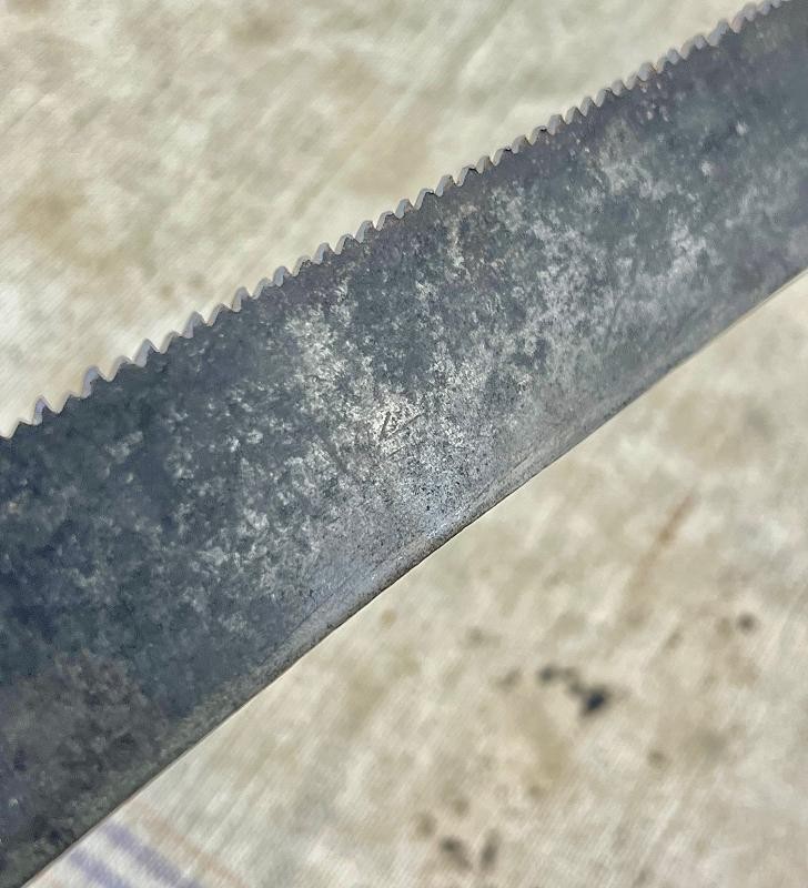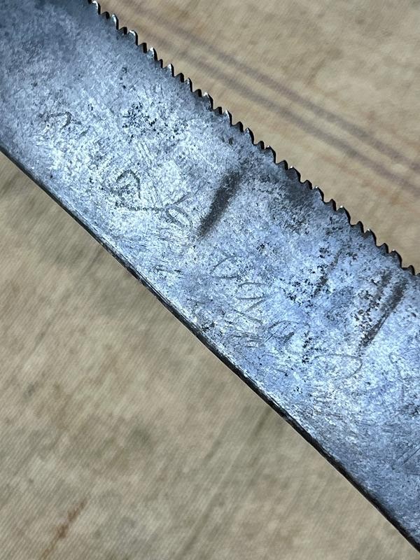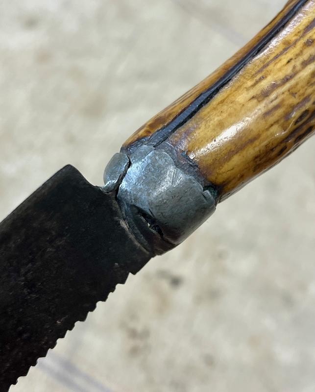 Antique Primitive Crown Antler "SAWTOOTH" Knife THAT SCREAMS American Frontier. This Antique Primitive Crown Antler "SAWTOOTH" Knife walks and talks. I truly love this Frontier Killer/Survival Knife. This Antique Primitive Crown Antler "SAWTOOTH" Knife was maybe the first multi-tool. This Antique Knife could field dress two or four-legged critters. The saw tooth back for game, bone, limbs, or an ugly flesh wound. This Antique Primitive Crown Antler "SAWTOOTH" Knife also has a name engraved on the blade. I have never tried to figure it out ... some research could add some value to this knife. The patina is killer and crown antler is gorgeous. Love the soft metal pout to secure the blade antler fit.