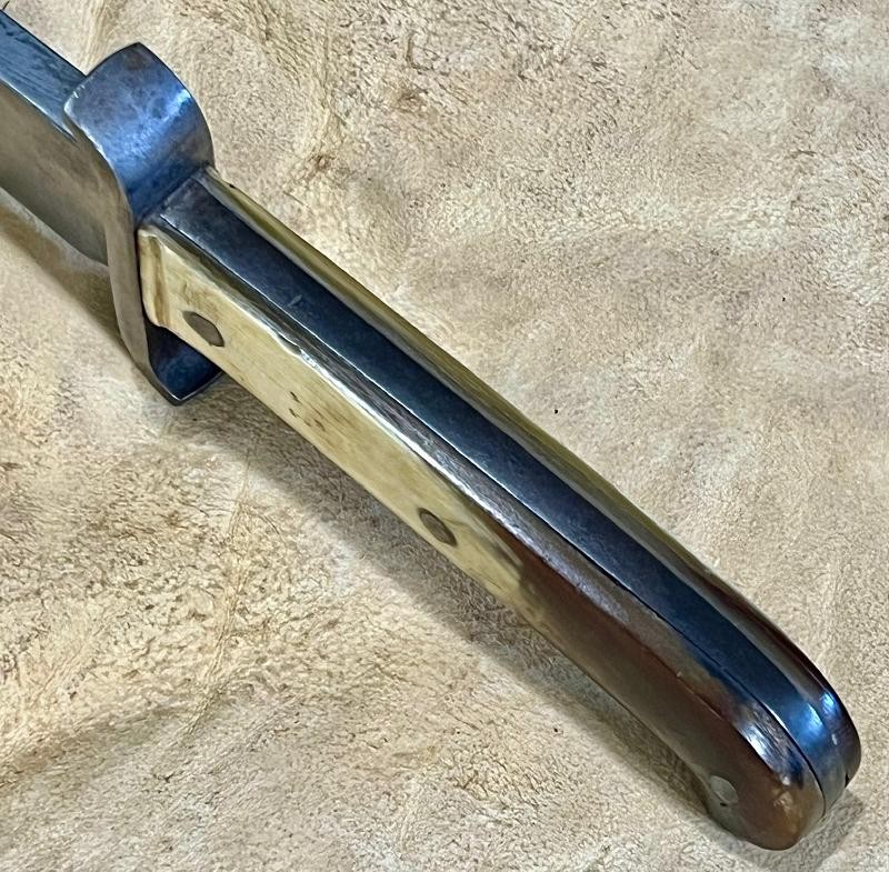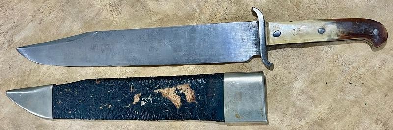 American Made Sheffield Style Bowie Knife Published in Norm Flaydermann's Book. This American Made Sheffield Style Bowie Knife has its original sheath. I love the length and mass of the clip point blade. The blade has original polish and did I say thick and massive. This American Made Sheffield Style Bowie Knife has a heavy "S" guard and bone handles. The 11 3/4" blade is truly beautiful. The overall length is 17" inches of American Craftsmanship. This American Made Sheffield Style Bowie Knife is an American Classic. This Antique Bowie Knife sure feels like a bowie made for John J. Rebel. It is massive and feels in hand like a 1861 Yankees have invaded knife. The American Frontier could have been tamed by with this clip point killer.