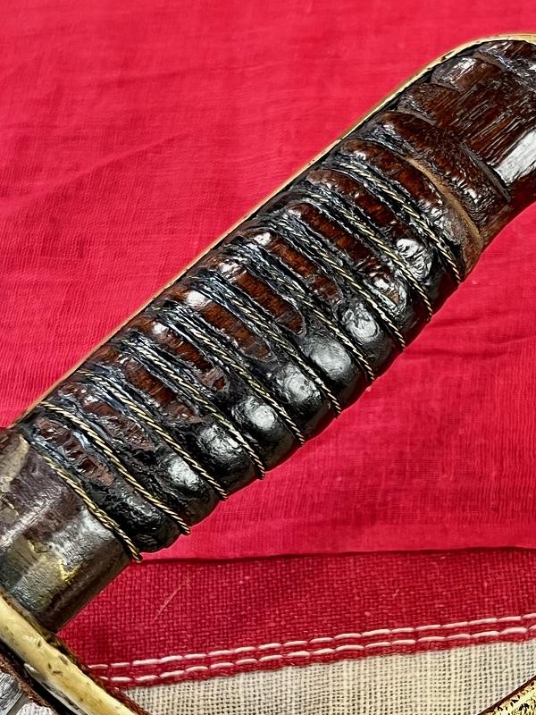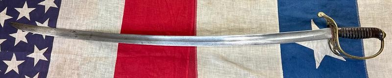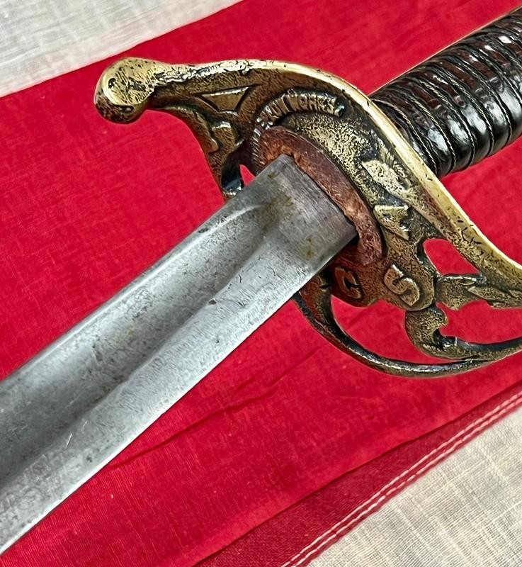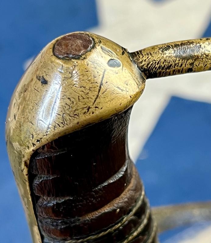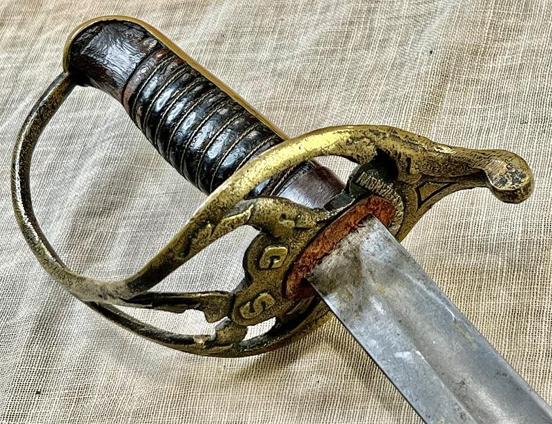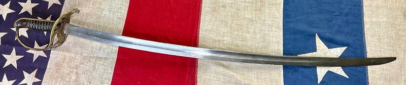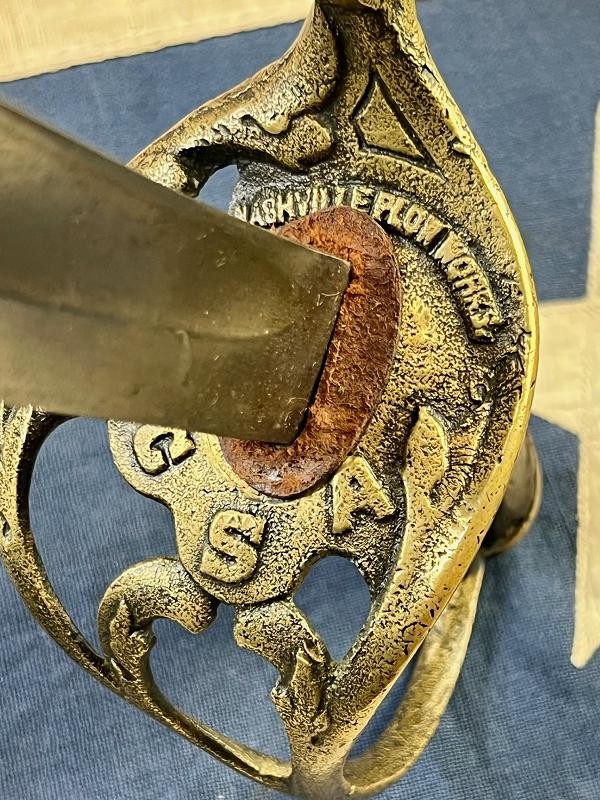 Nashville Plow Works Saber with KILLER AWESOME Southern Sand Casting. This Nashville Plow Works Saber has the clearest "Nashville Plow Works" maker mark you will ever see. The grip is better than most with some leather and most of the original thin Nashville wire. The blade is beautiful with original polish and unstopped fuller. The very end of the tip is blunted ... no doubt from dismounting Yank horse soldiers. The hilt is tight to the blade with no wobble or play. I truly love this Nashville Plow Works Saber. No scabbard ... the one it turned up in was not a "Nashville" made scabbard.