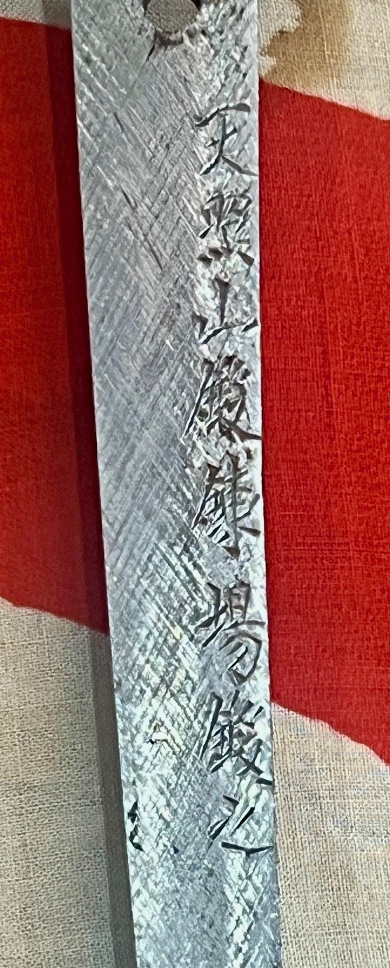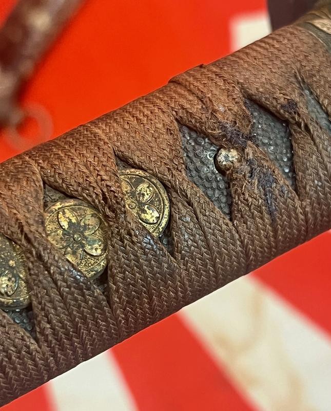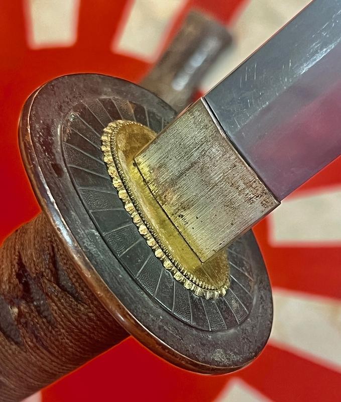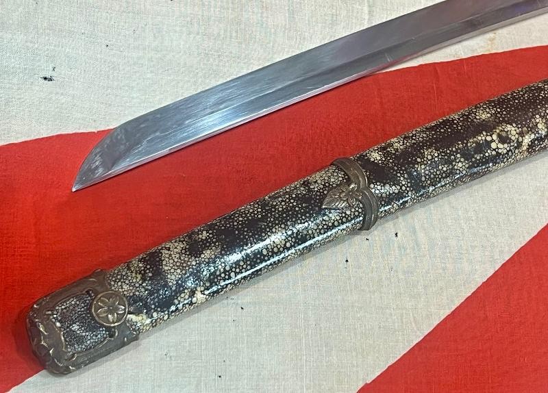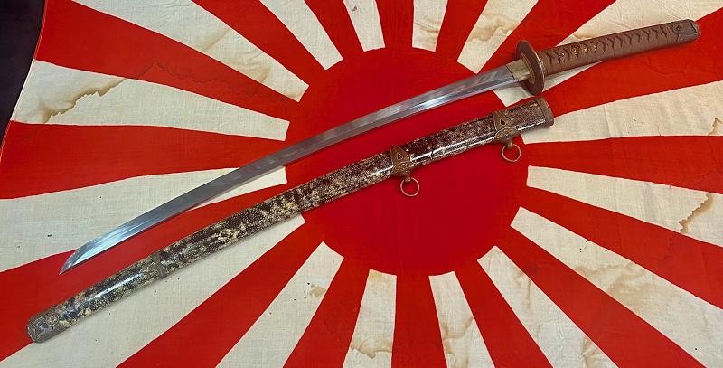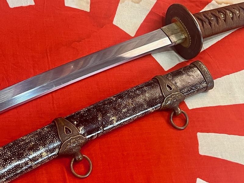 Japanese Naval Officer Sword with upgraded hardware and scabbard. This Japanese Naval Officer Sword has beautiful blade with no "battle dings". I love the "RISING SUN" pattern tsuba. This Japanese Naval Officer Sword has signed and dated tang. The brass scabbard hardware has the cutout "HEART" design, my favorite. Love the ray skin scabbard and has original handle wrap. There is one weak spot in the wrap where the wood pin is pushed. It is stable and mentioned for accuracy. Check out the images and enjoy. Many of these swords are at the bottom of the Pacific Ocean.