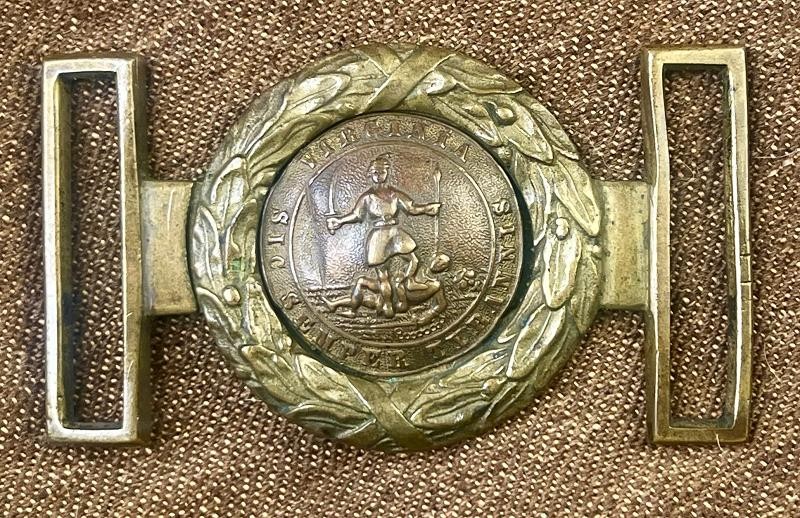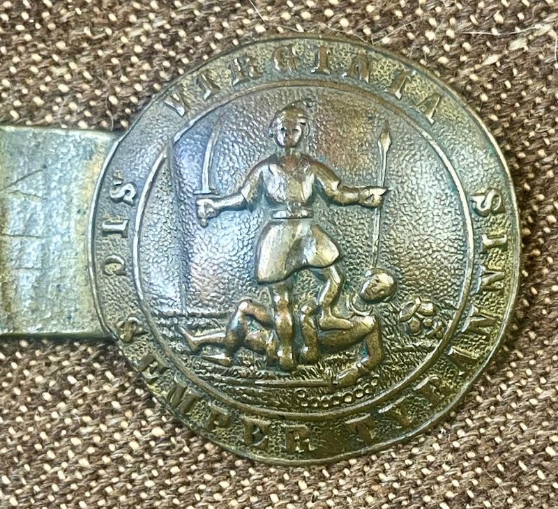 Virginia State Seal Buckle with stunning overall patina and condition. This Virginia State Seal Buckle is fresh to the market. This Virginia State Seal Buckle has matching numbers on the tongue and wreath belt loop. Enjoy the images and check out the video on YOUTUBE & TIKTOK. I have seen similar examples at the civil war relics shows for 5K. I have this stunning Virginia Officer Buckle Rebel Relics Priced.