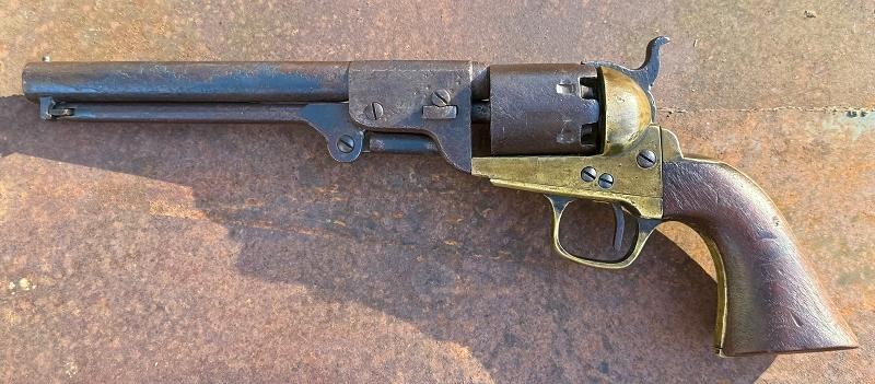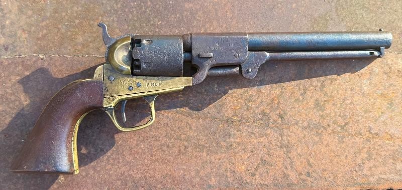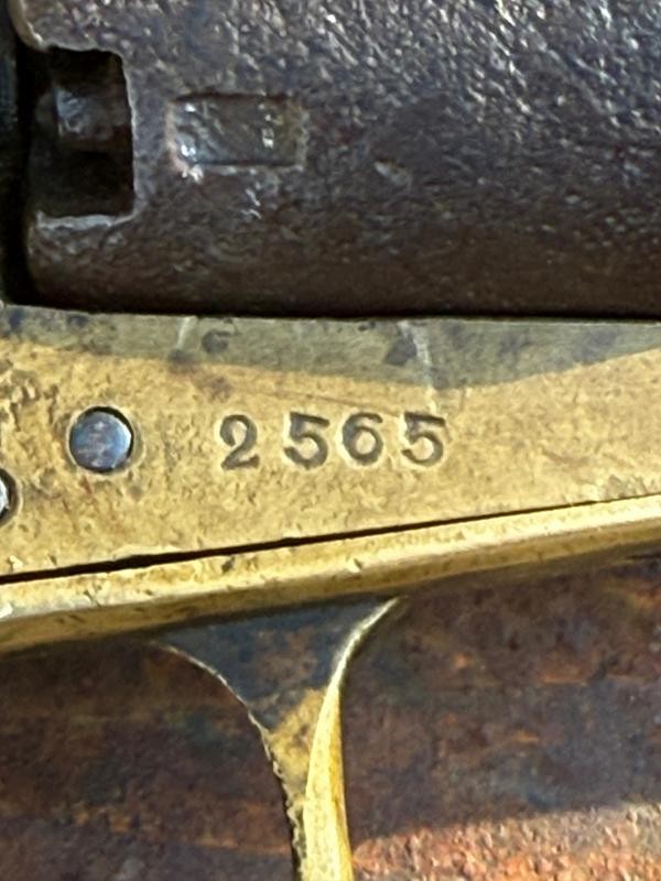 Griswold Confederate Revolver #2565 is an all-matching serial number example. This Griswold Confederate Revolver #2565 has never seen any modern restoration and I love that Rebel Brass Patina. The secondary number is #15 ... on the trigger guard, loading lever, and wedge. This Griswold Confederate Revolver #2565 was made in June of 1864. I love this Confederate Revolver, and it displays like a True Museum Centerpiece. I can send more pictures and talk about history, dates, and places if you need me to .... most of you know the thread count on a hammer screw .... so I keep my write ups quick.