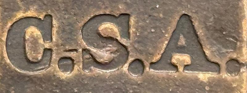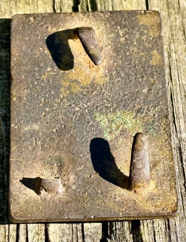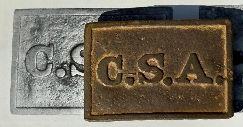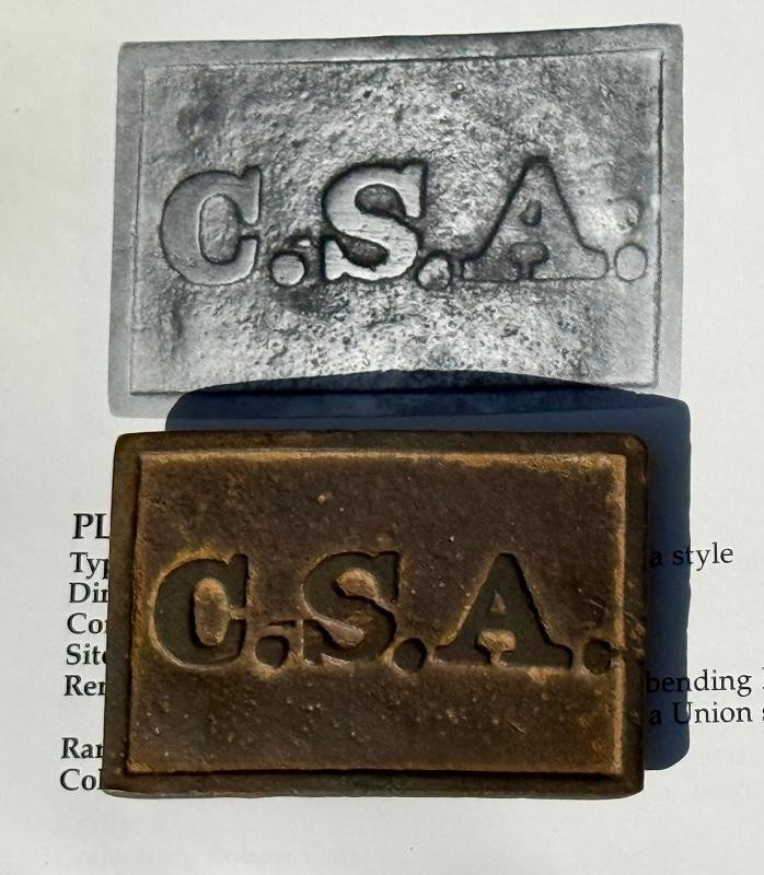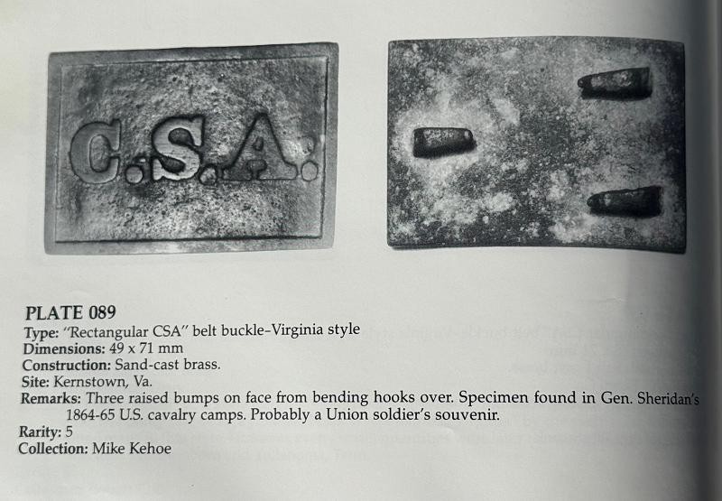 Confederate Buckle excavated in Virginia. This Confederate Buckle is a known pattern, and I added several images of the one from the book. There is a very obvious casting flaw in these examples. This Confederate Buckle was excavated around the Fredericksburg Campaign. Solid example with the "MAGIC LETTERS" standing tall & proud. One of the back hooks is "M.I.A." other than that ... this one is a beauty.