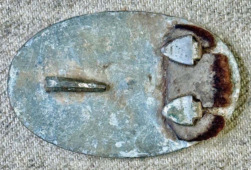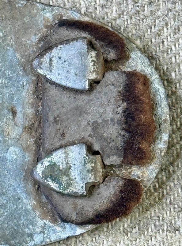 Excavated Regulation Infantry US Waist Belt Plate with partial leather belt still remaining under the hooks. This Excavated Regulation Infantry US Waist Belt Plate was dug on private property at The Battle of Franklin Tennessee. The back has full lead, all three studs, some original leather belt, and very attractive chocolate brown patina.