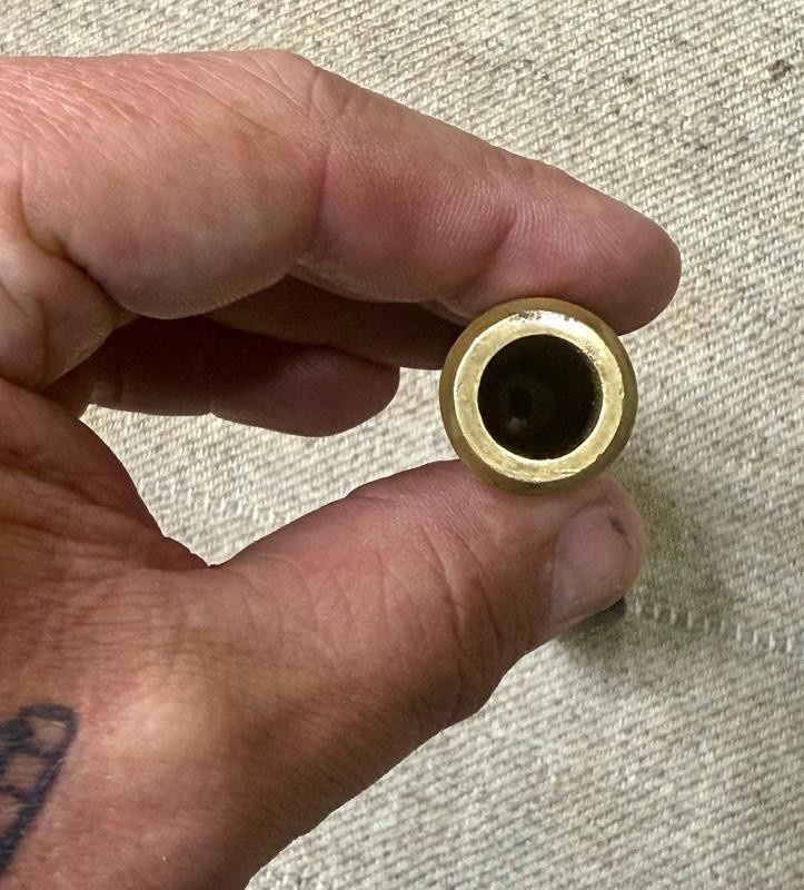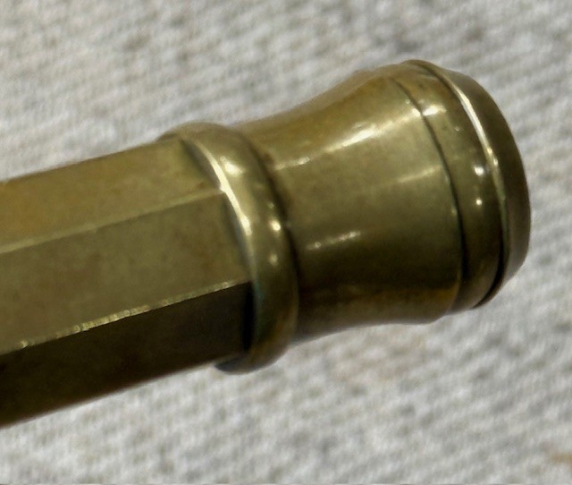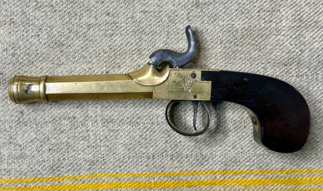 Brass Cannon Barrel Single Shot Pistol with Silver Shield on wood grip. This Brass Cannon Barrel Single Shot Pistol has nice action and mechanically sound. I love this Brass Cannon Barrel Single Shot Pistol, and they display great. This Antique Bad Boy is a big bore too.