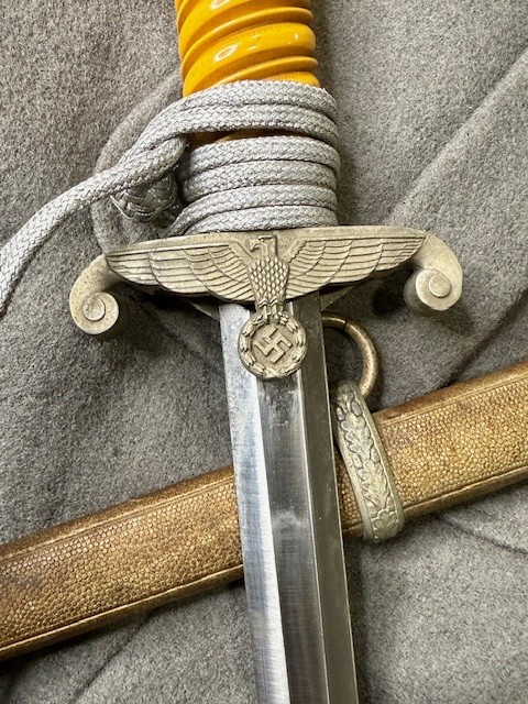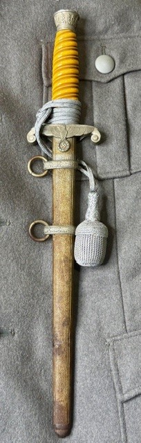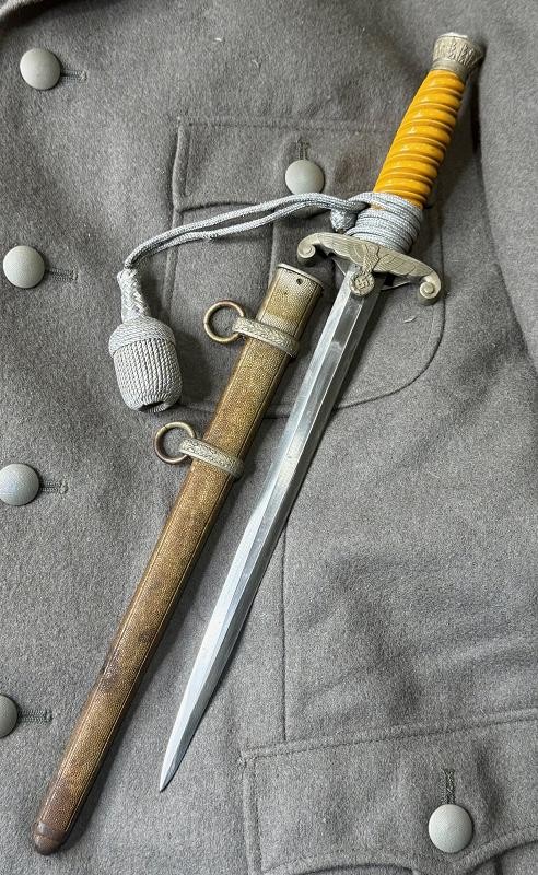 German Army Dagger by Rich Plumacher fresh to the market. This German Army Dagger by Rich Plumacher was brought home by a New York Soldier as a War Trophy. This German Army Dagger by Rich Plumacher is a rare maker to find for sale. The patina is consistent with better than average overall condition. The Portepee Knot is original to this dagger. This is a "TIME CAPSULE" just as brought back by the Veteran. The maker mark is clear, and blade is in good shape.