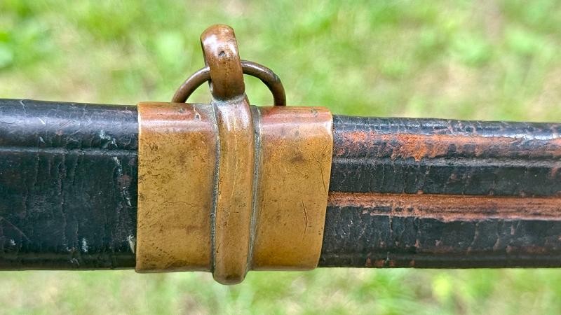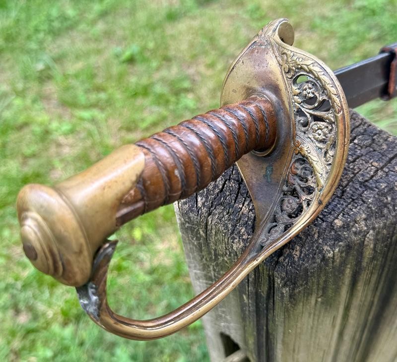 E. J. Johnston Confederate Foot Officer Sword with partial CS sheath. This E. J. Johnston Confederate Foot Officer Sword is Rebel Fresh to the market. I love the polished wood handle and check out the wear on the scabbard mount. This E. J. Johnston Confederate Foot Officer Sword is a solid example missing the handle wire.