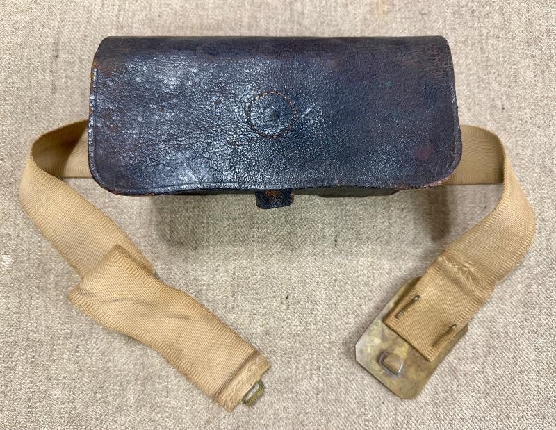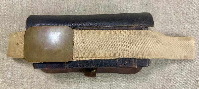 Militia .69 Caliber Cartridge Box on Belt in stunning condition. This Militia .69 Caliber Cartridge Box on Belt is fresh to market from North Carolina. Jaw Bone History of being used by N.C. Soldier from Hillsview or Hillsdale Military School. The picker could not remember the school name. This Militia .69 Caliber Cartridge Box on Belt is solid as they come. The wood insert is ready for action. The closure tab is solid. The original linen belt is strong. The clip corner buckle has a beautiful patina. Extremely scarce militia box on original belt. Rebel Relics Priced for unbeatable value.