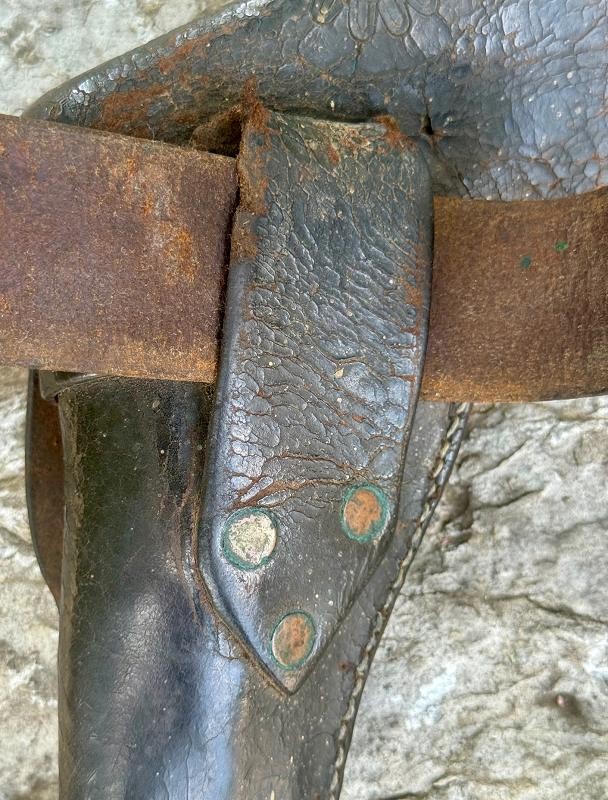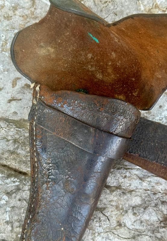 Confederate Cavalry Belt & Holster with everything a collector could want in a belt rig. This Confederate Cavalry Belt & Holster once housed a Griswold Revolver. I sold the Griswold many years ago and had this beauty for display ever since. This Confederate Cavalry Belt & Holster has the hidden belt buckle which would make long rides way more comfortable. The long-tooled flap secures the revolver and faster than a buckle holster. This is a very combat horse trooper functional Rebel Rig. No frills or magic letters but .... real deal Rebel Rig. Check out the REBEL RELICS PICTURES AND PRICE POINT.
