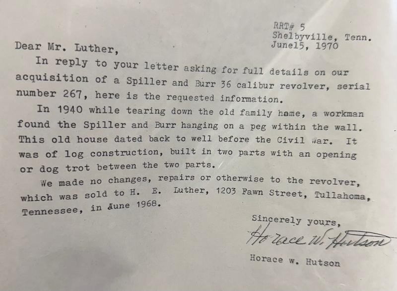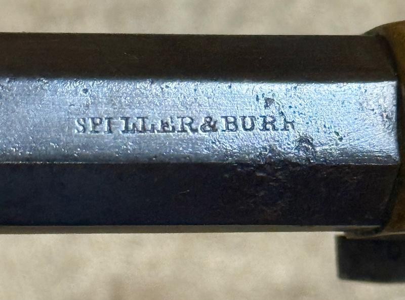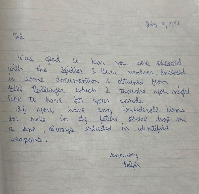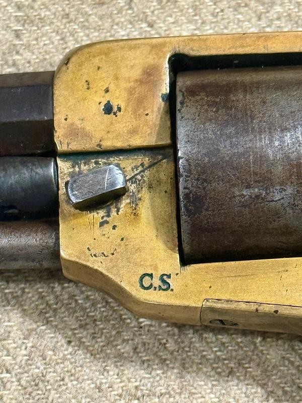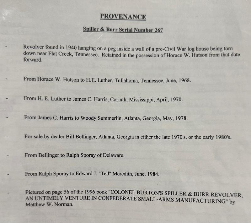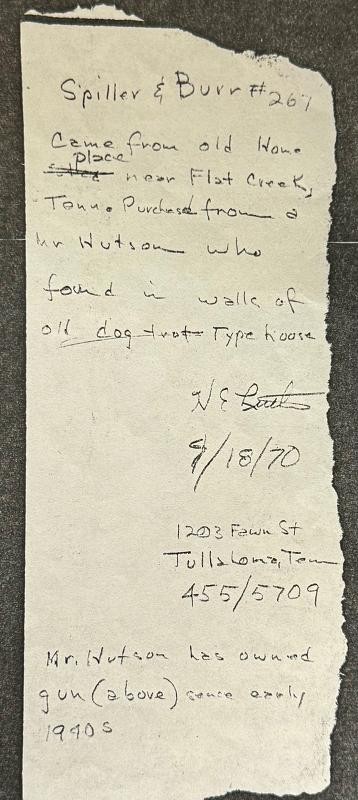 Spiller & Burr #267 Confederate Revolver with stunning condition and history. This Spiller & Burr #267 Confederate Revolver has wonderful history of ownership. Even the location and how it was found all dated and handwritten. This Spiller & Burr #267 Confederate Revolver has matching serial numbers and crisp action. The original wood grips are way above average and beautiful. The brass has that "REBEL BRASS" patina we love. The barrel has one of the best makers mark you will ever see. The frame is also "CS" marked. This Spiller & Burr #267 Confederate Revolver was issued to the Army of Tennessee in June 1863 and later found here in Middle Tennessee in the wall of a log cabin.