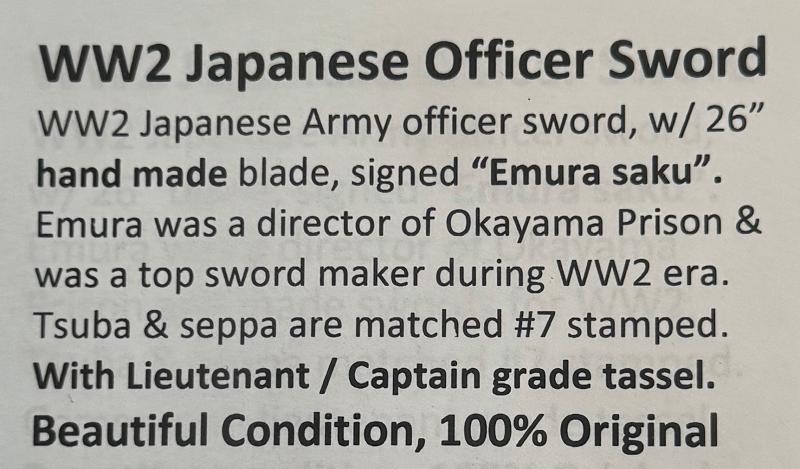 This Japanese Army Signed "Samurai" Sword should not last long at this price point. Clean Japanese Military Swords are solid investments and look awesome on the wall. Rebel Relics Hotline ..... 615-7727008