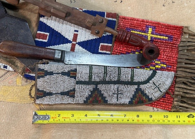 Native American Beaded Sheath & Knife with signs of honest wear and usage. I just bought a HUGE Native American Collection. The collection covers 100s of years of Native American History. This Native American Beaded Sheath & Knife is solid with no repair needed. Displays great with enough wear to have no doubt been carried. This Native American Beaded Sheath & Knife has beautiful, beaded design and color. This knife was labeled as fourth quarter of the 19th century. Checkout the images and feel free to Rebel Relics Yell with any questions.
