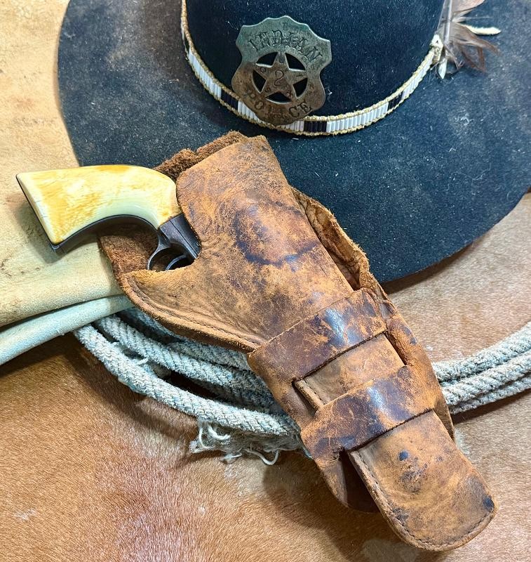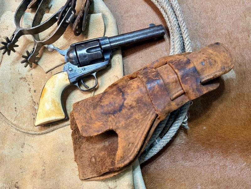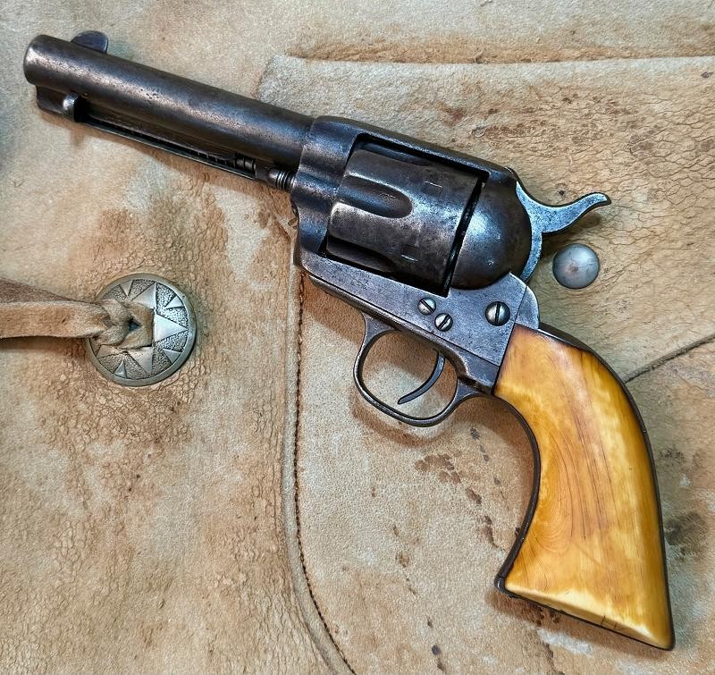 Colt Single Action Army with "HISTORY" unspoken and spoken oozing out the heavily worn patina. This Colt Single Action Army has fantastic original ivory grips. This Colt Single Action Army was sold to me with Cherokee Indian Police History. The holster has been with the revolver, and both match up. The wear and patina tell "HISTORY" that we can only wish we knew. I have no reason to doubt the "jawbone" Cherokee Territory Indian Police history. That said, I have added zero money for the story anyway. The action needs a little "JT LEATHERS" and I can twist his arm and bring him out of retirement if you want it fixed. I will include the repair charge and travel if no "let's make a deal" dealings go on. If you own a glock ... I would use it and leave the Colt SA alone.